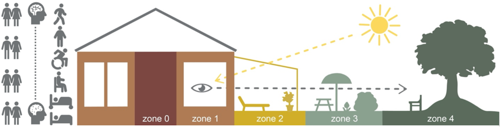 Här utvecklas en evidensbaserad riktlinje över betydelsefulla kvaliteter i olika delar av miljöerna, baserat på den så kallade zonmodellen (se figur nedan). Arbetet inleds med en genomgång av befintlig forskning (litteraturstudie) och kompletteras med en så kallad Delphi-studie, en metod där experter inom området får bidra med sin kunskap för att skapa konsensus kring vilka kvaliteter som bör prioriteras i respektive zon.